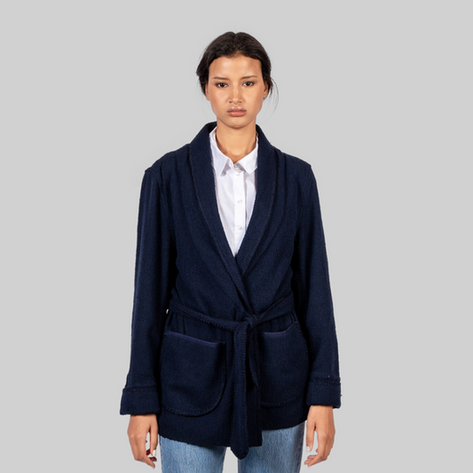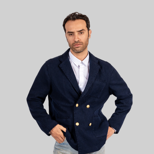 Handwoven Navy Double-Breasted Jacket with Metallic Buttons