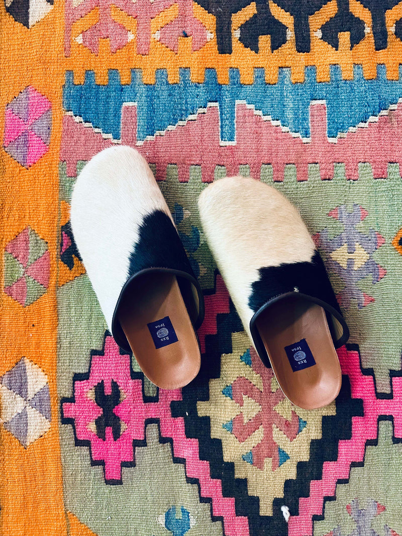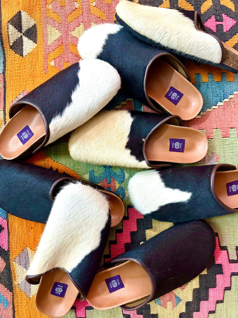 This signature pair of clogs is made by hand at our atelier from surplus cowhide leather from the food industry. They feature a cork bed molded to the shape of your foot, a suede upper lining, a leather trim and a durable rubber sole.